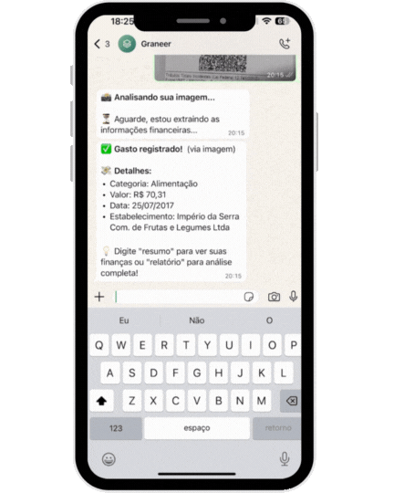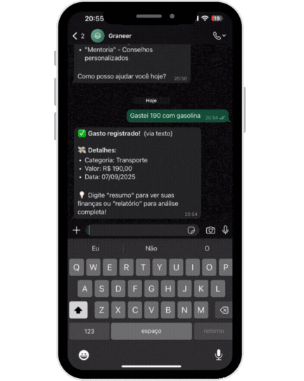 Simplesmente envie uma mensagem para o Graneer no WhatsApp com seus gastos ou receitas.